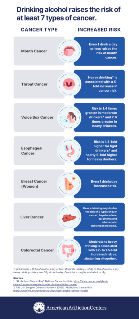 - Breast cancer (in women). Up to 1 drink a day can increase women’s breast cancer risk by 10% compared to women who don’t drink.