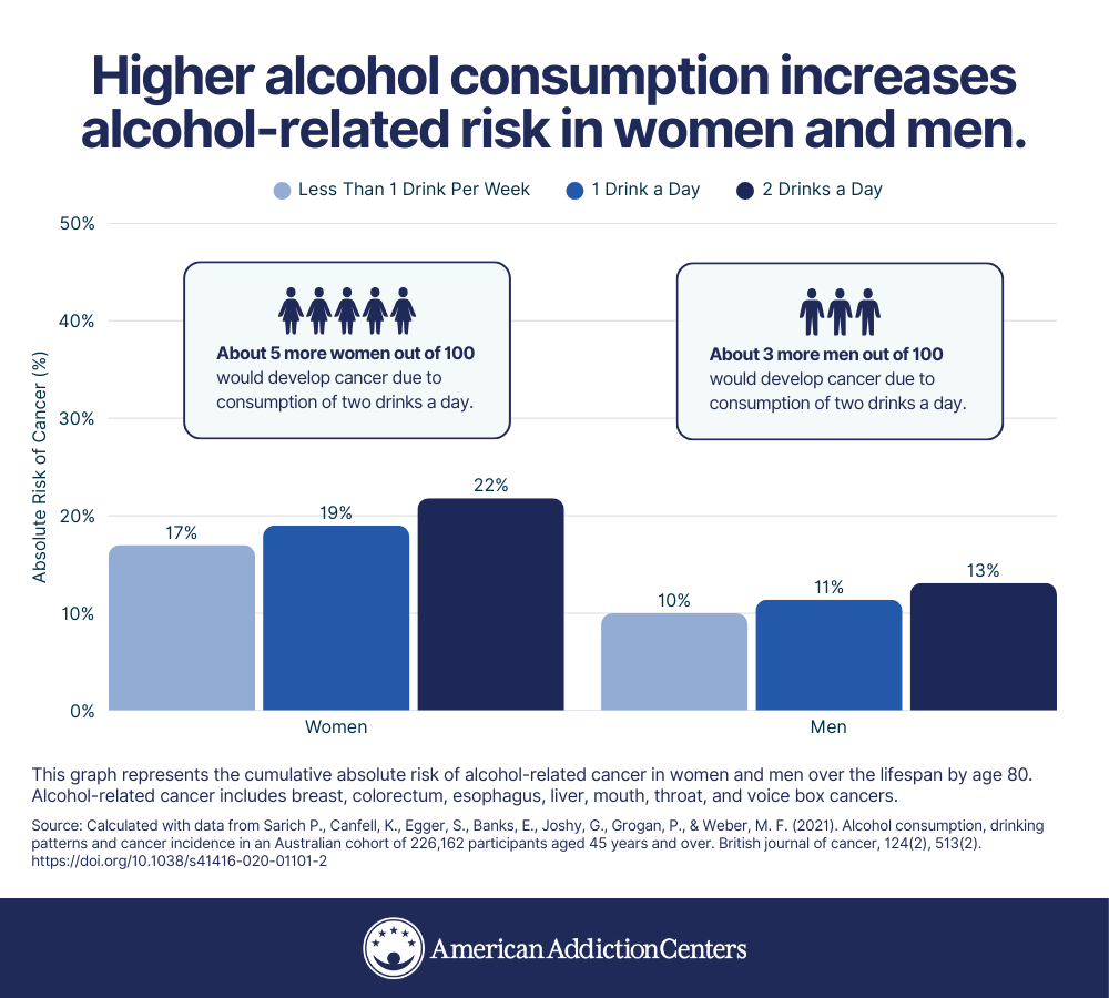 Women already have a higher risk of developing cancer in general, and unfortuantely alcohol use increases cancer risk more for women than it does for men;1 2 drinks a day for women increases their cancer risk by 5.3% (from 16.5% to 21.8%) versus 3.1% for men (10% to 13.1%).1